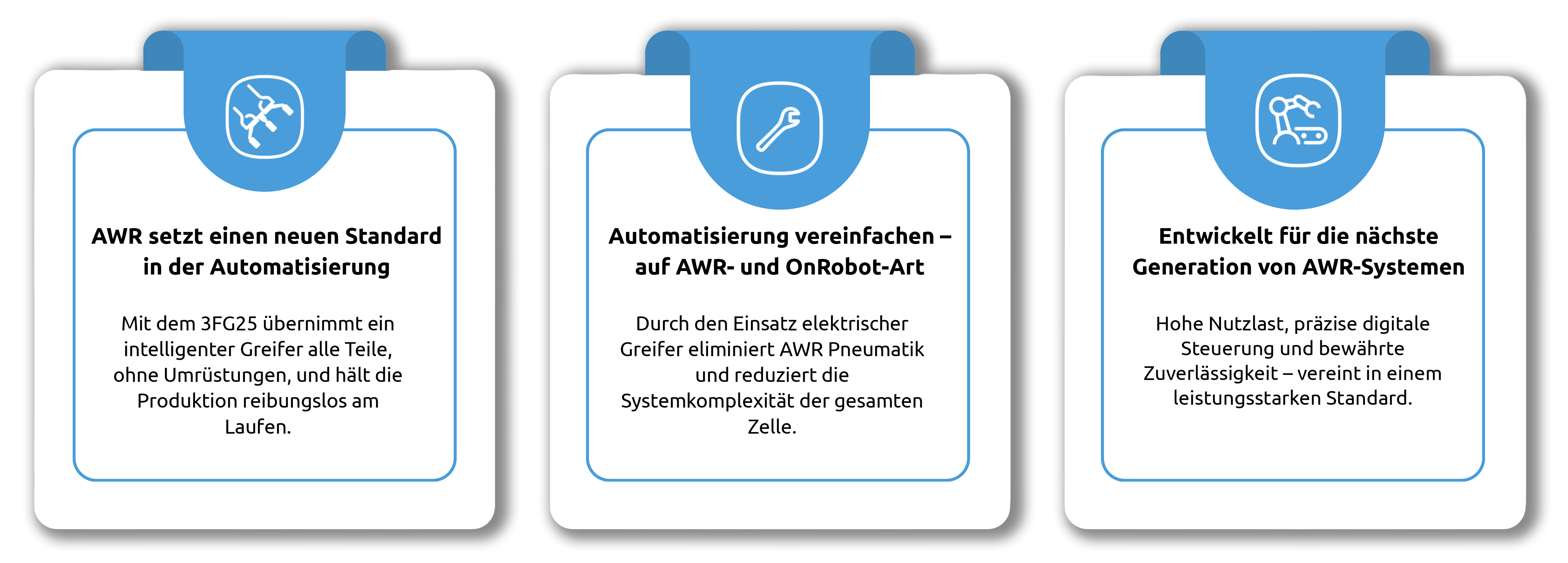 Die Entscheidung von AWR fiel auf den 3FG25 Greifer aufgrund seiner hohen Traglast, seiner kompakten Bauweise und der Möglichkeit, Greifkraft und Position digital zu steuern. Im Gegensatz zu pneumatischen Alternativen ermöglicht der 3FG25 die Handhabung unterschiedlicher Teile ohne Anpassungen beim Wechsel der Teilegröße, da Hub und Greifkraft präzise für jedes einzelne Teil programmiert werden können.