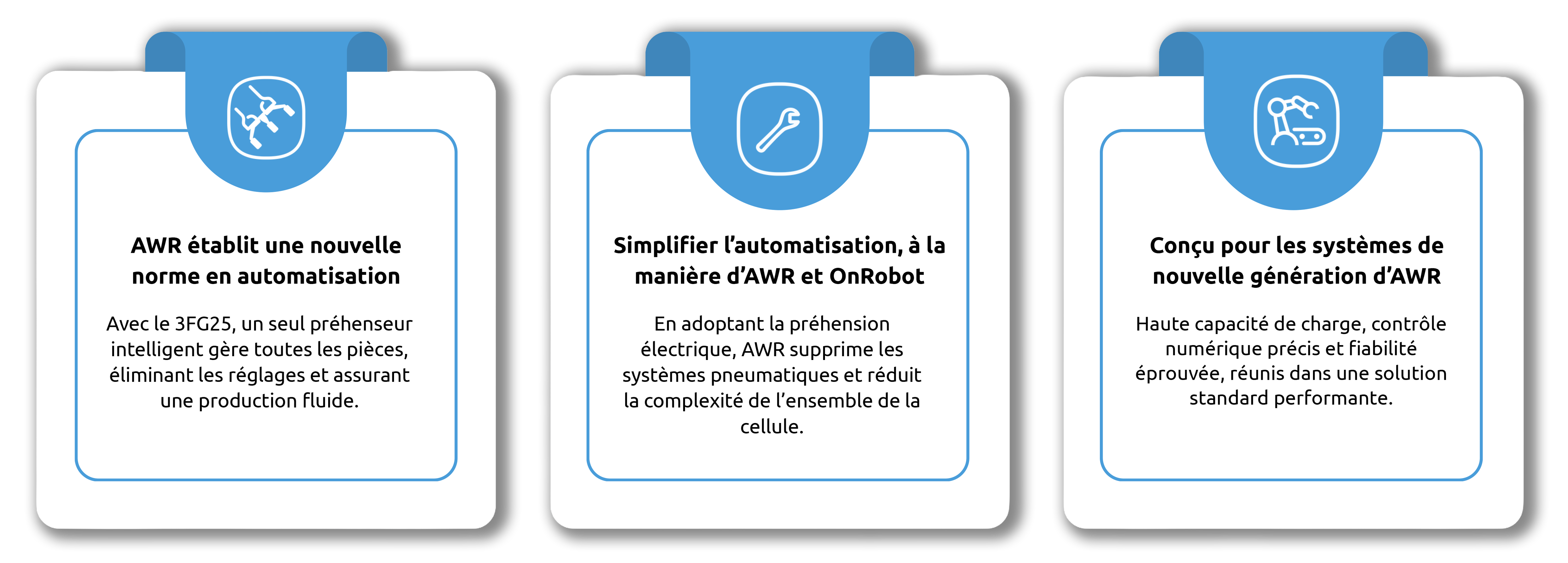 Grâce à sa grande course, à sa charge utile élevée et à sa capacité de commande numérique de la force et du positionnement, la pince électrique à 3 griffes relève le défi le plus persistant pour les fabricants produisant une grande diversité de pièces : la nécessité de régler manuellement les pinces à chaque lancement qu’une nouvelle taille de pièce dans la production. Pour optimiser le débit, AWR a mis au point une configuration à double chargement avec deux pinces 3FG25, permettant au robot de saisir une pièce finie et de placer une ébauche en un seul cycle, réduisant ainsi le temps de production et augmentant le retour sur investissement.