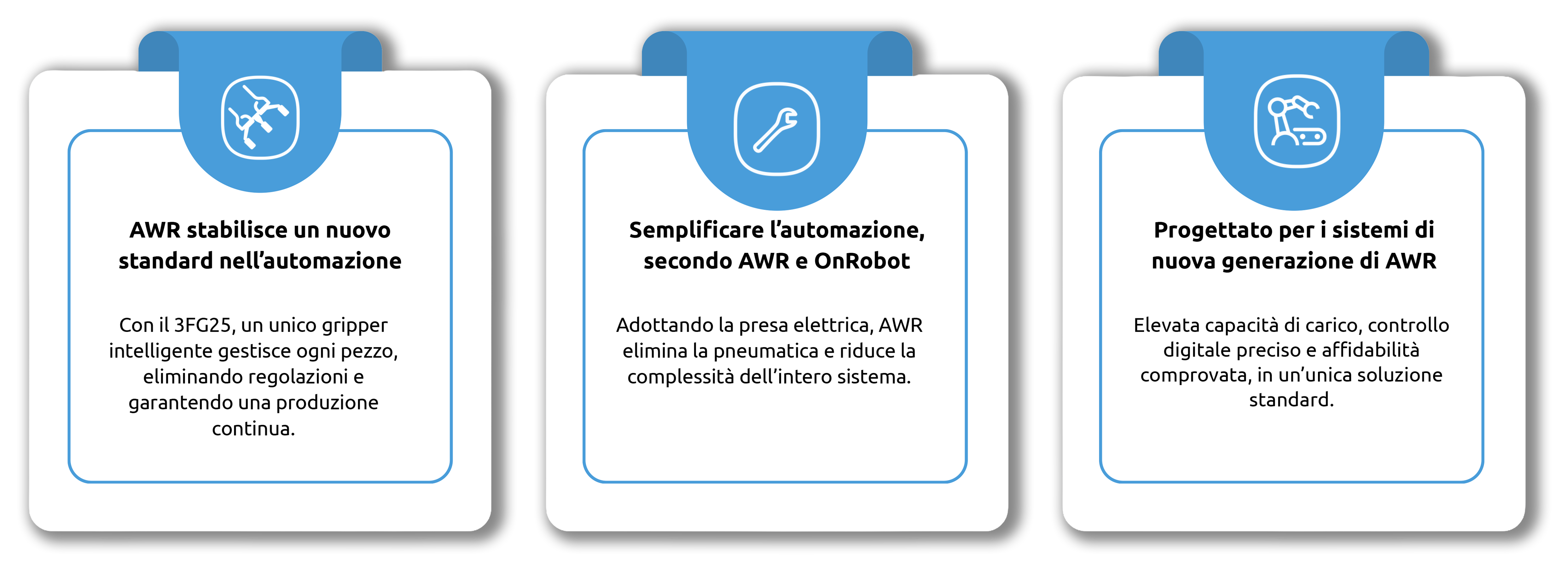 La scelta di AWR è stata guidata dall’elevata capacità di carico del gripper 3FG25, dalle dimensioni compatte e dalla possibilità di controllare digitalmente la forza di presa e il posizionamento. A differenza delle alternative pneumatiche, il 3FG25 consente di gestire diversi pezzi senza regolazioni durante il cambio formato, poiché corsa e forza possono essere programmate con precisione per ogni singolo pezzo.