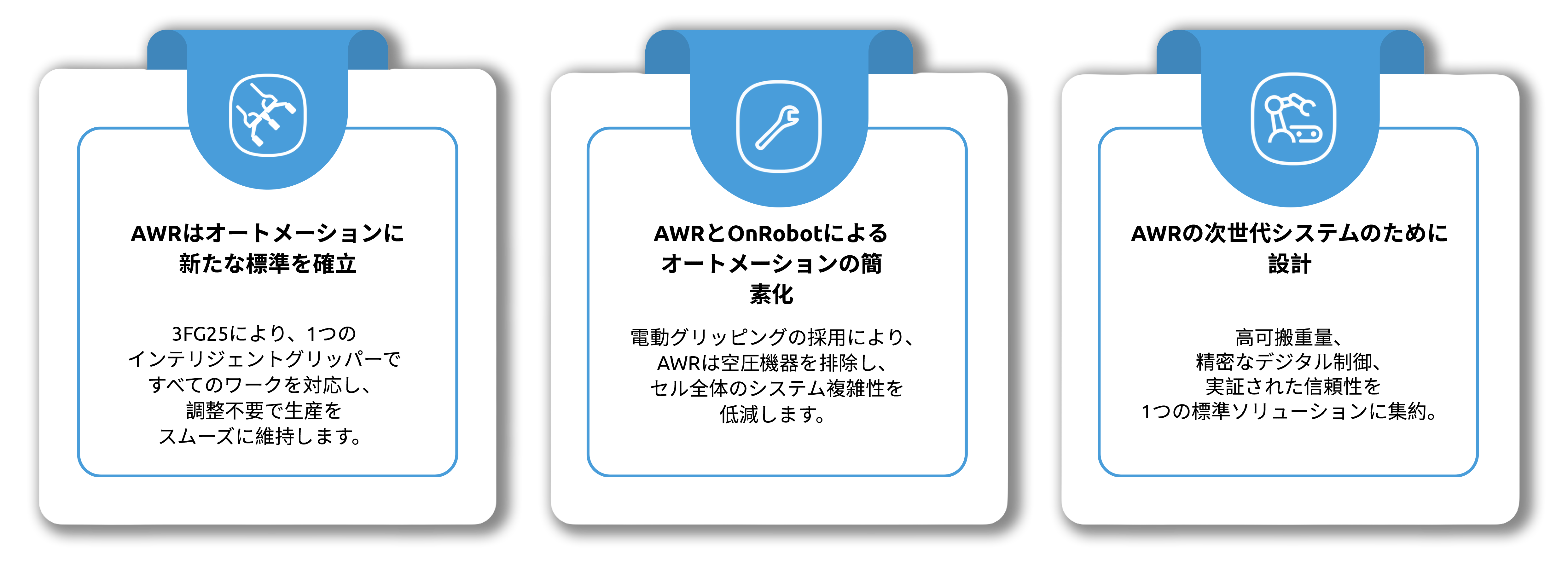 AWRが3FG25を選択した理由は、その高い可搬重量、コンパクトなサイズ、そして把持力と位置をデジタルで制御できる点です。空圧グリッパーとは異なり、3FG25はストロークと把持力を各部品に合わせて正確にプログラムできるため、部品サイズが変わっても調整なしでさまざまな部品を扱うことができます。